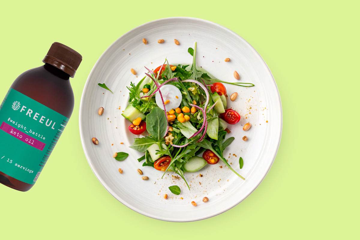 2. Добавляем 1 столовую ложку keto oil (на 1 порцию салата). В данном случае МСТ заменяет другие виды масла (растительное, оливковое). Масло keto oil наполнит салат легким ароматом кокоса.